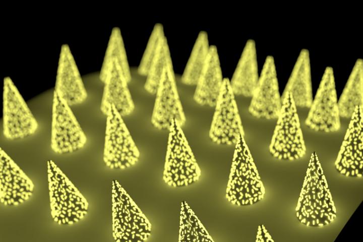 But the team has a secret weapon of sorts: "plasmonic-fluors," an ultrabright fluorescence nanolabel. Compared with traditional fluorescent labels, when an assay was done on microneedle patch using plasmonic-fluor, the signal of target protein biomarkers shined about 1,400 times as bright and become detectable even when they are present at low concentrations.