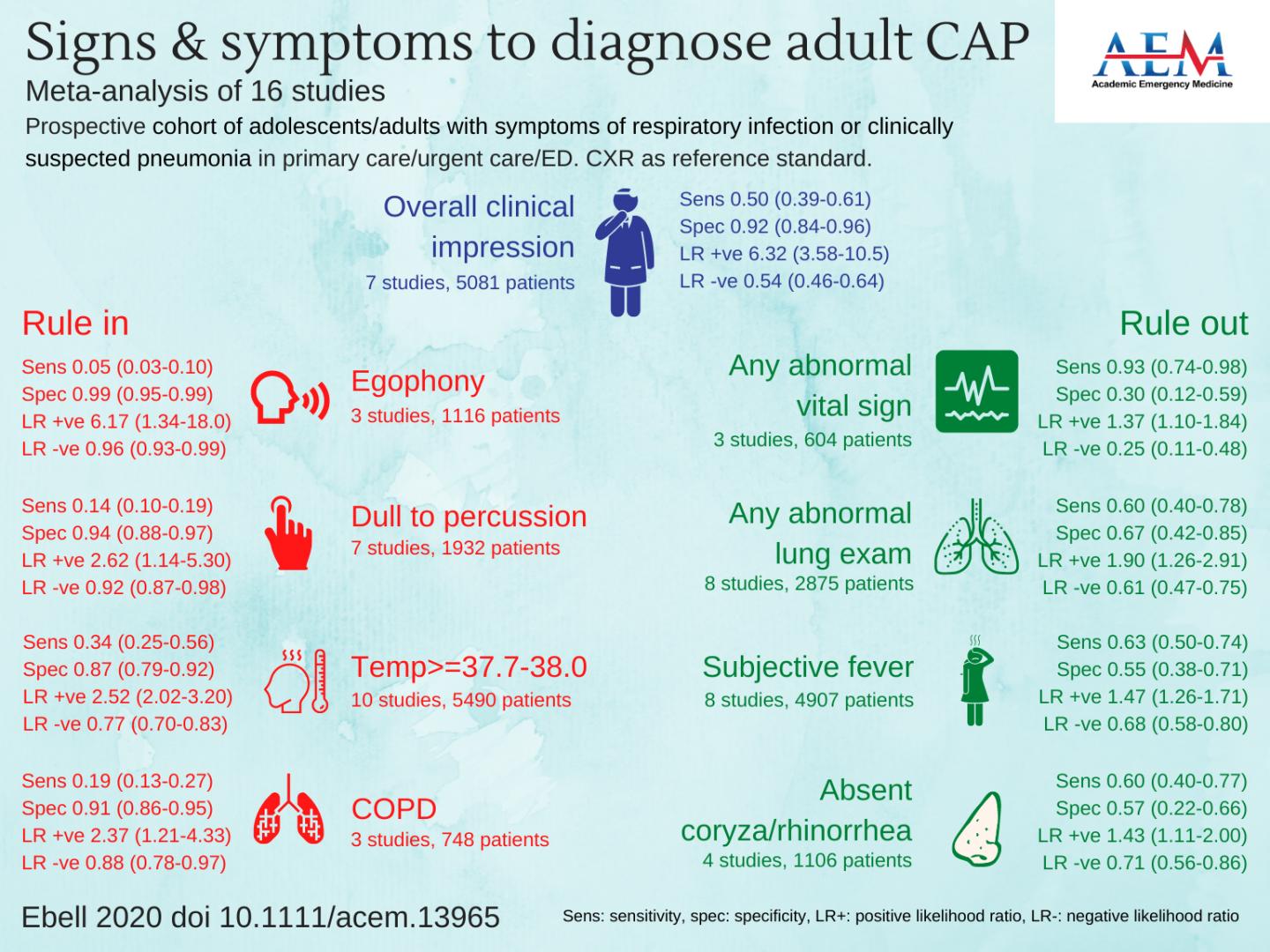 image: Meta-analysis of 16 studies. Prospective cohort of adolescents/adults with symptoms of respiratory infection or clinically suspected pneumonia in primary care/urgent care/emergency department. Chest x-ray as reference standard.