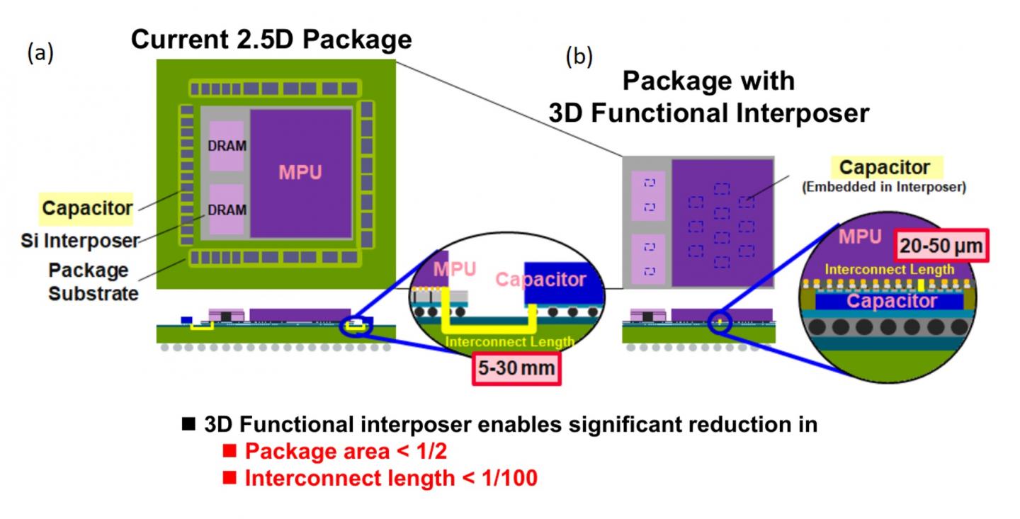 In modern "2.5D" packages, chips such as DRAMs and microprocessors sit atop interposers with through-silicon vias, vertical conducting tunnels that bridge the connections in the chips with solder bumps on the package substrate. Capacitors are placed on the package substrate close to the components they serve, and a connection between their terminals and those of the chip has to be made, spanning 5-30 mm (Figure 1a). This layout not only increases the necessary package substrate area, but also causes problems such as high wiring resistance and noise due to the long interconnections.