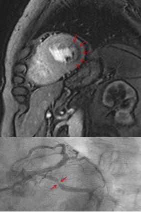 image: Measuring blood flow in the myocardium with magnet resonance imaging (top). The dark area in the myocardium (arrows) shows a pronounced reduction of blood flow. The cardiac catheterization of the same patient (bottom) shows a clear constriction of the artery.