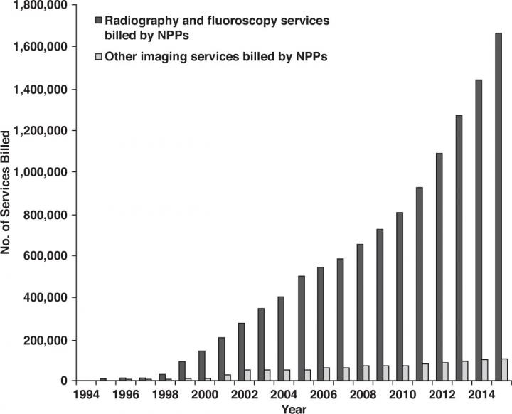 Across all years, radiography and fluoroscopy constituted most of the NPP-billed imaging services and remained constant over time (e.g., 94% of all services billed in 1994 and 2015), representing only 0.01% and 2.1% of all Medicare radiography and fluoroscopy services. However, absolute annual service counts for NPP-billed radiography and fluoroscopy services increased from 10,899 to 1,665,929 services between 1994 and 2015.