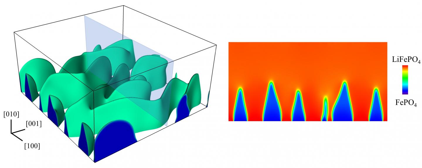 image: At left, a 3D model by Rice University materials scientists shows a phase boundary as a delithiating lithium iron phosphate cathode undergoes rapid discharge. At right, a cross-section shows the "fingerlike" boundary between iron phosphate (blue) and lithium (red). Rice engineers found that too many intentional defects intended to make batteries better can in fact degrade their performance and endurance.
