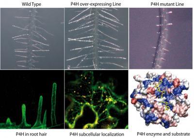 Roots in plants form specialized long cells known as root hairs that take nutrients and water from soil (upper panel left). In this issue of Science Velasquez et al. have found a protein called prolyl 4-hydroxylases (P4Hs) that determines how much this root's hairs can grow. They have obtained plants with extra long root hairs and also with shorter ones by changing the expression of P4Hs (upper panel centre and right). Theauthors also have shown that P4Hs are expressed in root hairs by tagging P4H with the green fluorescent protein (GFP). In the same way, at subcellular levels P4Hs localizes in the endoplasmatic reticulum (ER) andGolgi apparatus. P4Hs are important for plant cells because they define the glycosylation sites (sites where sugars can be added on a protein) on a certain cell wall proteins. Finally, a molecular representation a P4H together with its substrate, a cell wall proteins (yellow) is shown (lowerpanel right).