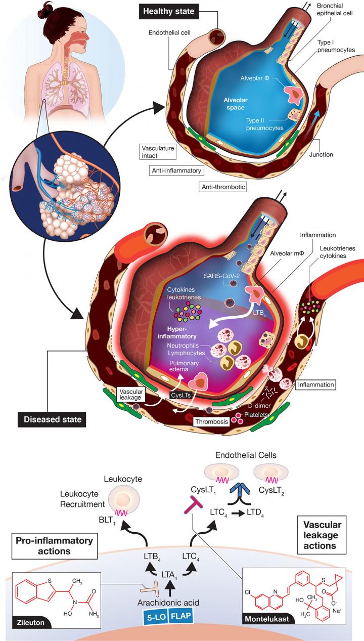 In COVID-19, providing zileuton/montelukast combination prior to out-of-control host inflammatory cell recruitment to the lungs and before pulmonary edema sets in is paramount. Initiation of treatment with zileuton/montelukast should take place early on, shortly after a positive test is confirmed and before major symptoms arise. Currently it remains very difficult to predict which patients will progress to severe COVID-19 disease. The standard of care is basically symptomatic control (i.e. acetaminophen for fever and muscle pain) and observation. The proposed zileuton/montelukast combination could readily be added in this setting, with the goal to switch off the hyper-inflammatory response. The incentive to move forward quickly is vital to combat COVID-19 while waiting for a preventative vaccine or other treatments.