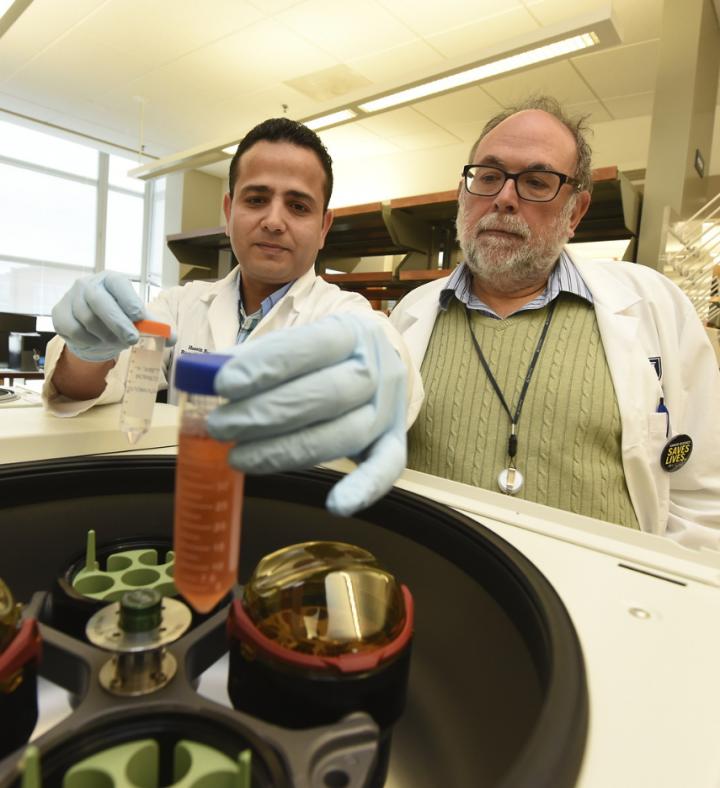 image: This is a photograph of Drs. Esteban Celis and Hussein Sultan in the Georgia Cancer Center at Augusta University laboratory.