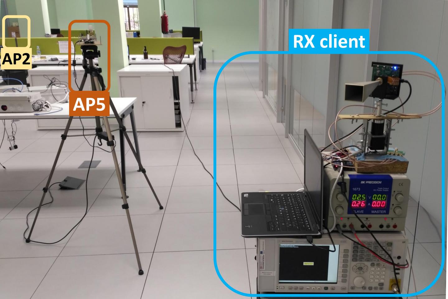 image:Â Figure 1. (first above) Photo of the open space measurement setup of Fig. 2, showing the client, AP2 (access point 2) and AP5 (access point 5).