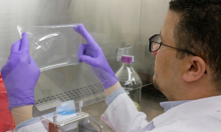 image: Researcher Abdelrahim Hassan, who was a visiting scholar in the Department of Food Science when the research was conducted, examines the novel composite film that offers antimicrobial properties and at the same time provides the strength, transparency, gas permeability and water resistance that the meat industry is looking for.