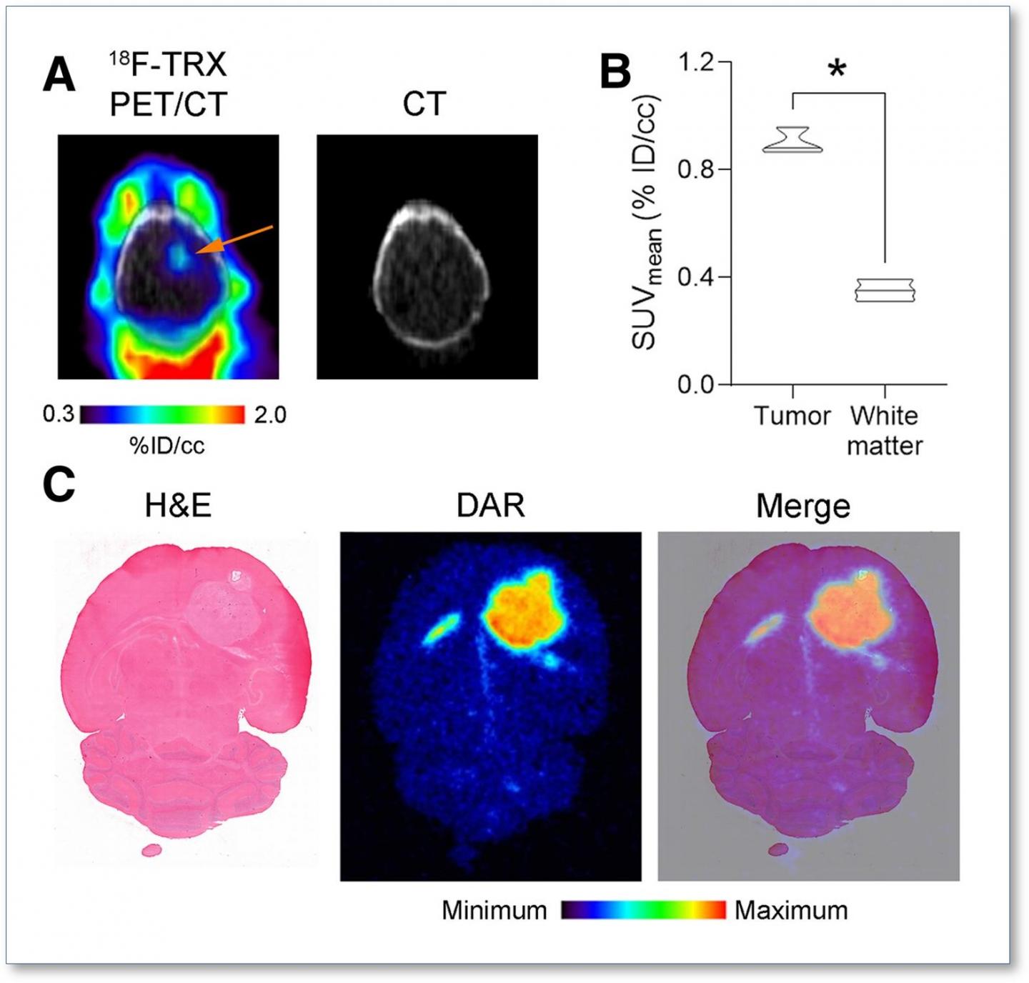 image: LIP expansion is detectable in an orthotopic glioma model with 18F-TRX. A. 18FTRX PET/CT data showing radiotracer uptake in a U87 MG tumor (arrow) implanted within the right hemisphere of a mouse brain. The image was acquired at 90 min post injection. B. Quantification of 18F-TRX uptake using region of interest analysis of the PET data from mice bearing U87 MG tumors (n = 3). The tumor uptake was compared to uninvolved normal white matter on the contralateral region of the brain. C. Digital autoradiography showing the distribution of the radiotracer within a coronal section of the mouse brain. The tissue was stained with H&E and merged with the pseudocolor image of the autoradiography.