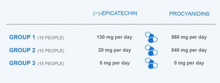 image: In a month-long randomized and double-blinded study, 45 healthy male adults were divided into three groups taking different amounts of flavanols and procyanidins to determine the effect of each on a range of cardiovascular endpoints. One group of participants consumed a cocoa extract containing 130 mg of a flavanol called (−)-epicatechin (pronounced "minus epicatechin") as well as 560 mg of procyanidins. The second group took cocoa extract capsules delivering a nearly equivalent amount of procyanidins (540 mg), but only 20 mg of (−)-epicatechin. The third group took placebo capsules that were free of both flavanols and procyanidins, but otherwise nutritionally matched to the capsules consumed by the other two groups. Importantly, all capsules were matched for their methylxanthine (caffeine and theobromine) amounts.