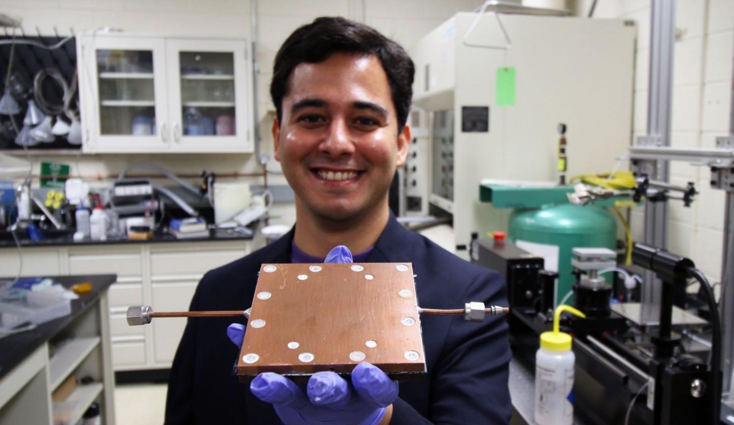 image: Lab member Mojtaba Edalatpour shows the thermal diode developed by Boreyko's team.