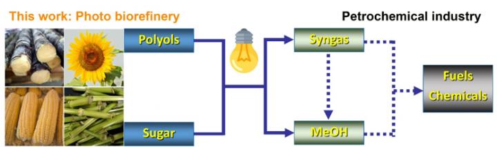 In the current study, the researchers converted biomass-derived polyols and sugars into methanol and syngas (CO+H2) via UV light irradiation at room temperature. The bio-syngas could be further used for the synthesis of methanol.