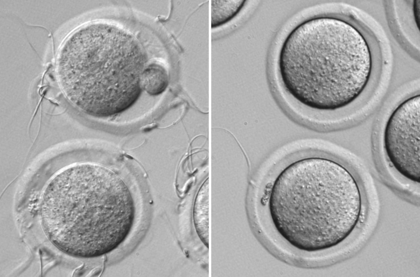 image: Impaired zona pellucida binding of Nell2 knockout sperm Left, Wild-type sperm binds to zona pellucida, a specialized extracellular matrix surrounding the egg. Right, Nell2 knockout sperm cannot bind to zona pellucida.