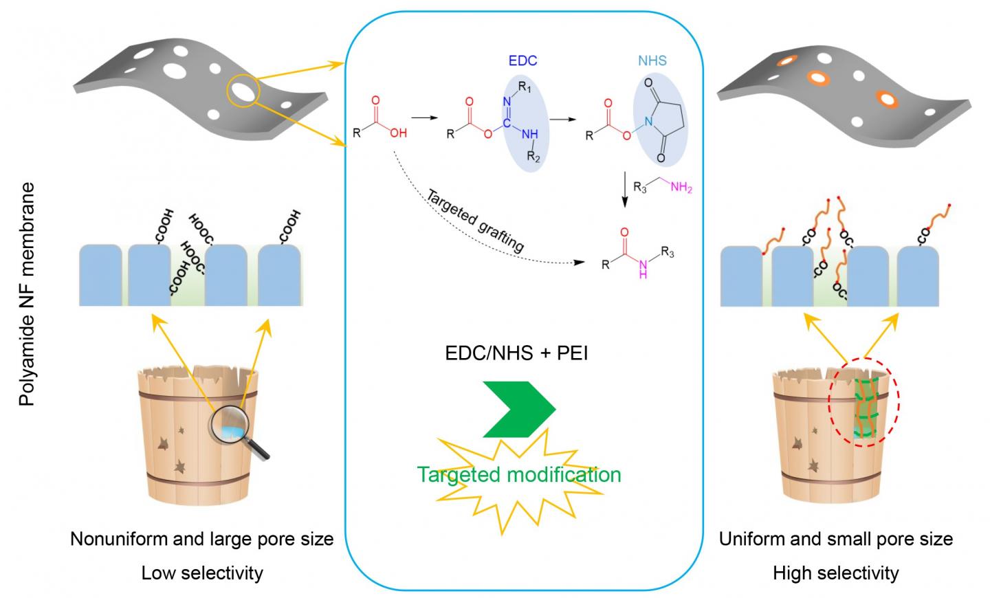 Targeted modification can regulate the pore size distribution and electronegativity of polyamide NF membranes, and thus improve the separation selectivity.