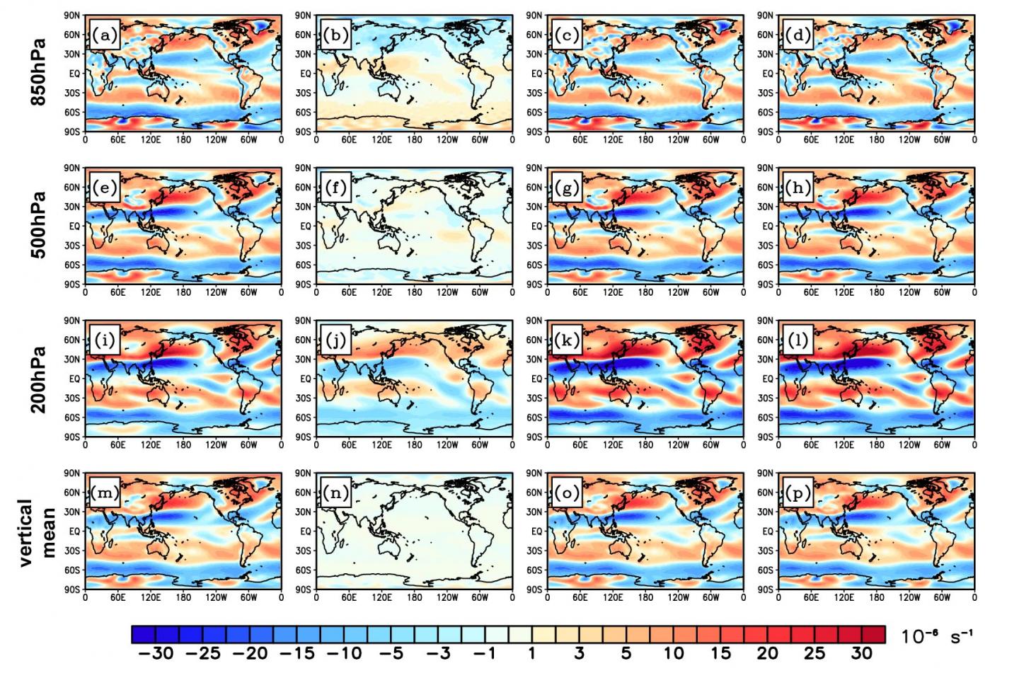 image: Climatological mean of vertical vorticity (d) and its decomposition: (a) vertical vorticity of horizontal circulation, (b) vertical vorticity of meridional and zonal circulations, (c) vertical vorticity of horizontal, meridional and zonal circulations at 850 hPa (1979-2013) for DJF. e~h, i~l and m~p same as a~d, but for 500 hPa, 200 hPa and the vertical mean surface, respectively.