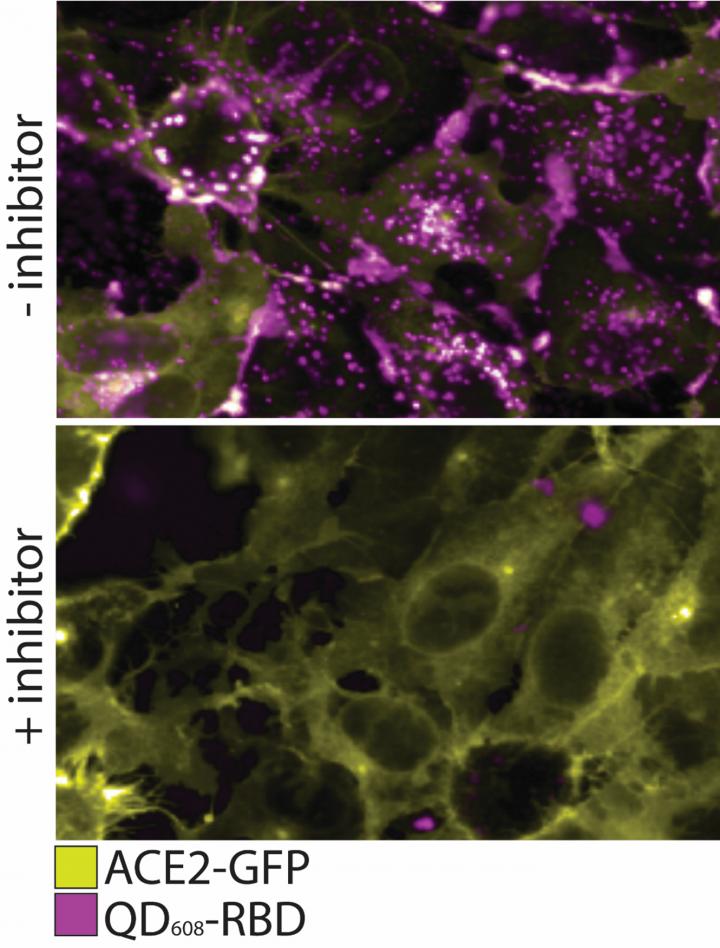 image: Here we see the QD608-RBD binds ACE2 and induces endocytosis. In this figure, the top panel shows ACE2-GFP (yellow) expressing cells binding and internalizing QD608-RBD (magenta). In the bottom panel, an inhibitor is added to prevent binding of QD608-RBD to ACE2-GFP, and the presence of ACE2-GFP on the cell surface is strong with little to no QD608-RBD visible. Scientists at the U.S. Naval Research Laboratory and National Center for Advancing Translational Sciences (NCATS), published their findings in ACS Nano, a monthly peer-reviewed scientific journal, on their collaboration to develop SARS-CoV-2 nanoparticle probes that are used to study fundamental interactions between SARS-CoV-2 Spike proteins and human cells.