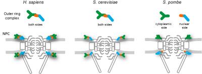 image: These are schematic drawings of the outer ring complex and the NPC structure in H. sapiens (left) and S. cerevisiae (middle) in comparison to that in S. pombe (right).