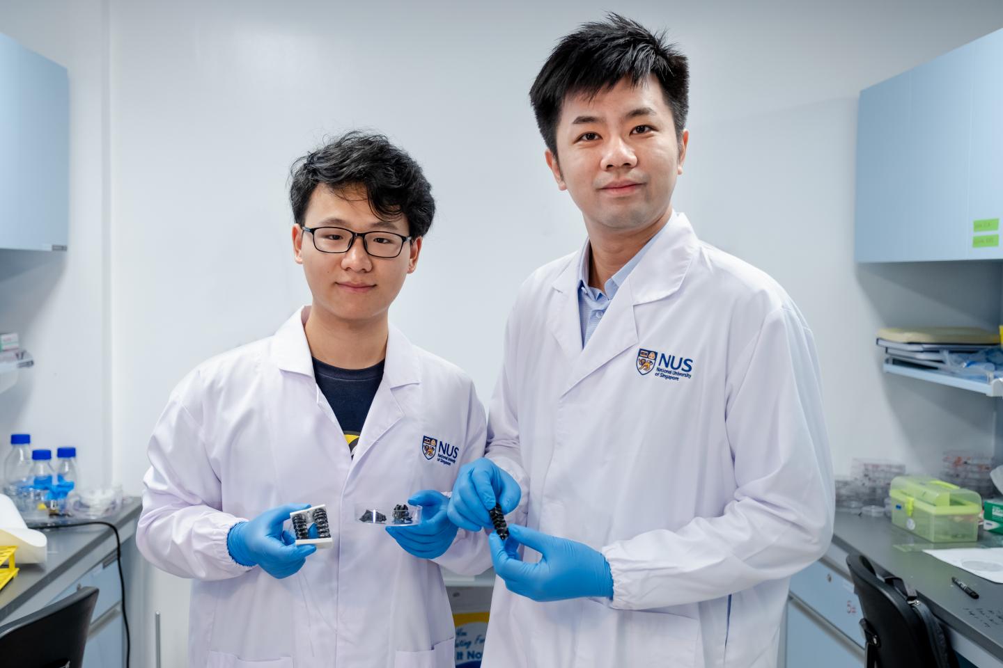image: NUS Assistant Professor Chen Po-Yen (right) and doctoral student Yang Haitao (left) and their team created a new metallic material for soft and flexible robots.