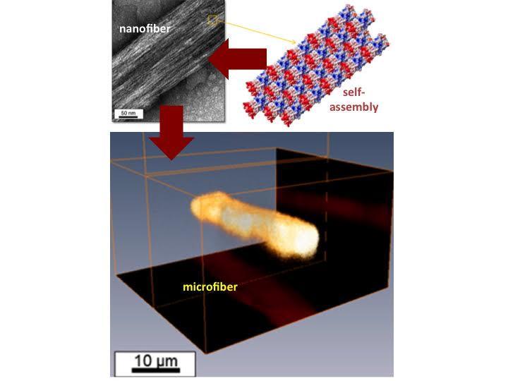 Researchers at the New York University Polytechnic School of Engineering have broken new ground in the development of proteins that form specialized fibers used in medicine and nanotechnology. For as long as scientists have been able to create new proteins that are capable of self-assembling into fibers, their work has taken place on the nanoscale. For the first time, this achievement has been realized on the microscale—a leap of magnitude in size that presents significant new opportunities for using engineered protein fibers.