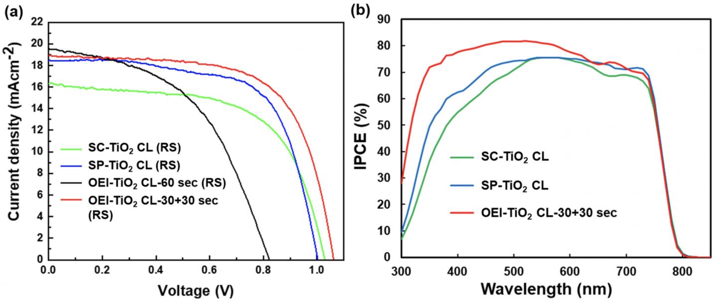 image: (a) RS J-V characteristics of PSCs made with SC- TiO2 CL, SP- TiO2 CL, OEI- TiO2 CL-60 sec, and OEI- TiO2 CL-30+30 sec. (b) IPCE spectra of PSCs made with SC- TiO2 CL, SP- TiO2 CL, and OEI- TiO2 CL-30+30 sec.