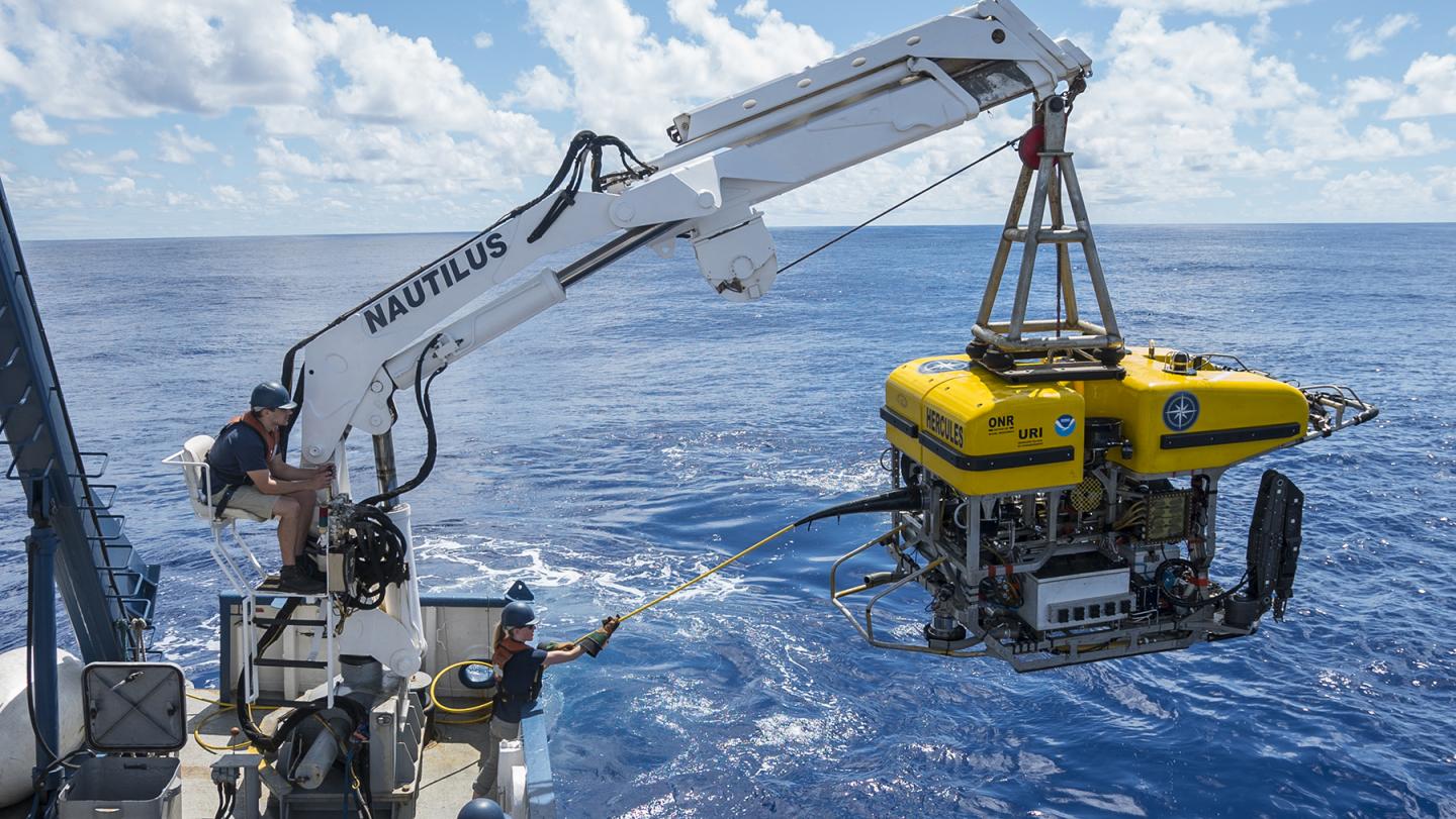 image: The remotely operated vehicle (ROV) Hercules is launched from E/V Nautilus.
