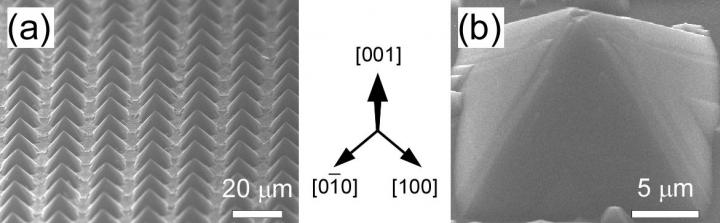 "Our ordered array of isosceles silicon pyramids were all the same size and had flat facet planes. We confirmed these findings by low-energy electron diffraction patterns and electron microscopy," explains lead author of the study Aydar Irmikimov.