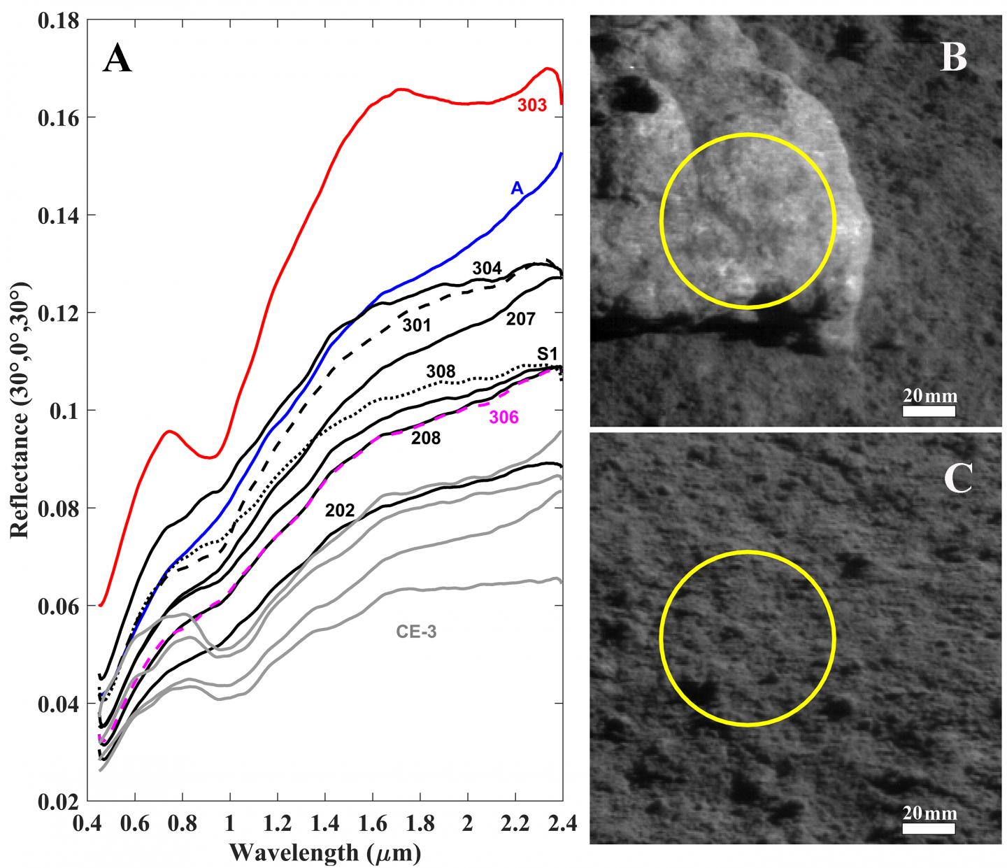 The rock spectrum shows similar band peak positions, but stronger absorptions, suggesting relatively fresh exposure. This rock is likely representative of the original bedrock in the Mg-Pyroxene Annulus of SPA basin. This rock is >20 cm in size, sitting on the regolith surface. No grains can be unambiguously recognized on the surface based on the image with spatial resolution of 0.6mm/pixel, suggesting a fine- or medium-grain-size texture (