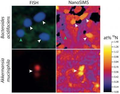 This shows corresponding FISH (left) and NanoSIMS (right) analysis of gut microorganisms. Bacteroides or Akkermansia cells were stained with the aid of specific FISH probes. The amount of stable isotope 15N was analyzed in the same cells by NanoSIMS. The higher the 15N content of a cell, the more intestinal mucosa was taken up. White arrows point to cells that have taken up mucus. The Bacteroides cell marked with a green arrow has not fed on mucus.