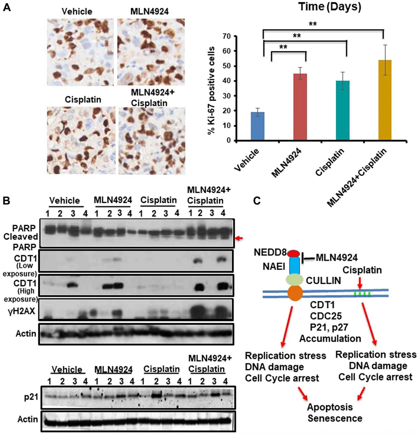 image: MLN4924 treatment induces DNA damage by stabilizing CDT1 and accumulates the cells in S phase which are enhanced by MLN4924/cisplatin co-treatment. (A) Representative images of Ki-67 staining (40× magnification) and quantitation of Ki-67 IHC. The results were from 4 tumors and data were presented as mean ± SD. **p < 0.001 indicates a significant difference. (B) WB showing the levels of cleaved PARP, CDT1, γH2AX and p21 in vehicle, MLN4924, Cisplatin, and MLN4924/Cisplatin treated tumors. (C) A model showing the pathway leading to apoptosis and senescence upon NAE1 inhibition by MLN4924 and synthetic lethality upon MLN4924/cisplatin cotreatment.