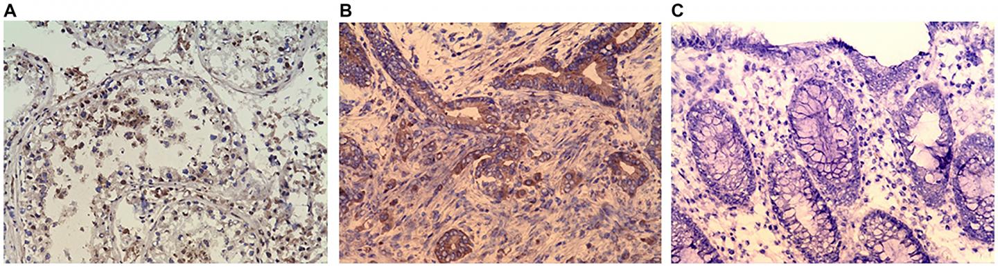 image: (A) Immunohistochemistry (IHC) staining of testis (positive control). (B) IHC staining of colonic adenocarcinoma. (C) IHC stating of Normal colonic mucosa (negative control). Purified rabbit anti-human CABYR polyclonal antibody for CABYR a/b and c antigen isoforms were used in IHC.