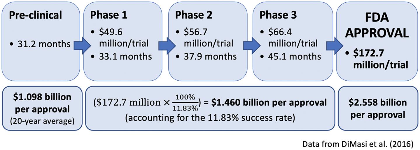 image: Summary of the time and cost for drug development (modified from DiMasi et al. [2016]). Costs factor in the 11.83% success rate through all three trials.