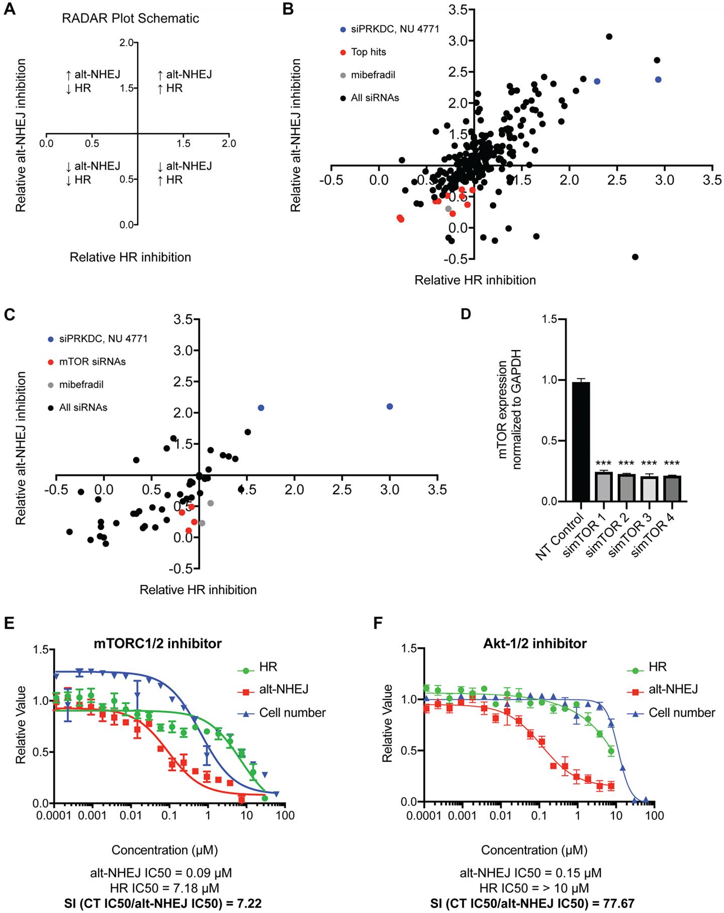 image: Identification of potential regulators of the selective alt-NHEJ inhibition of mibefradil. (A) A schematic representation of the Relative Assessment of DNA Repair (RADAR) plot showing the significance of the different quadrants and their correlation with DNA repair activity. (B) An siRNA screen of 240 siRNAs against common DDR proteins in the EJ-DR assay showing the top hits phenocopying mibefradil in red, the controls siPRKDC (DNA-dependent protein kinase catalytic subunit) and 2 μM NU 4771 (DNA-PK inhibitor) in blue, and 3 μM and 6 μM mibefradil in gray. (C) A focused screen of the deconvoluted siRNAs for the top eleven hits identified in the previous screen in the EJ-DR assay. The top hit simTOR is indicated in red, the controls siPRKDC (DNA-dependent protein kinase catalytic subunit) and 2 μM NU 4771 (DNA-PK inhibitor) in blue, and 3 μM and 6 μM mibefradil in gray. (D) Deconvoluted siRNAs to mTOR reduced mRNA expression of mTOR to ~20% of the non-targeting (NT) control. Gene expression is normalized to a GAPDH control. (n = 3, ***p < 0.001 by Student's T test) (E) Dose-response curve of mTORC1/2 inhibitor (mTORC1/2i) in the EJ-DR assay showing alt-NHEJ activity in red, HR activity in green, and cytotoxicity (CT) in blue. mTORC1/2i showed a selectivity index (SI), calculated as CT IC50/alt-NHEJ IC50, of 7.22. (F) Dose-response curve of Akt1/2-inhibitor (Akt-1/2i) in the EJ-DR assay. Akt-1/2i showed an SI of 77.67. Data are represented as mean ± SEM.