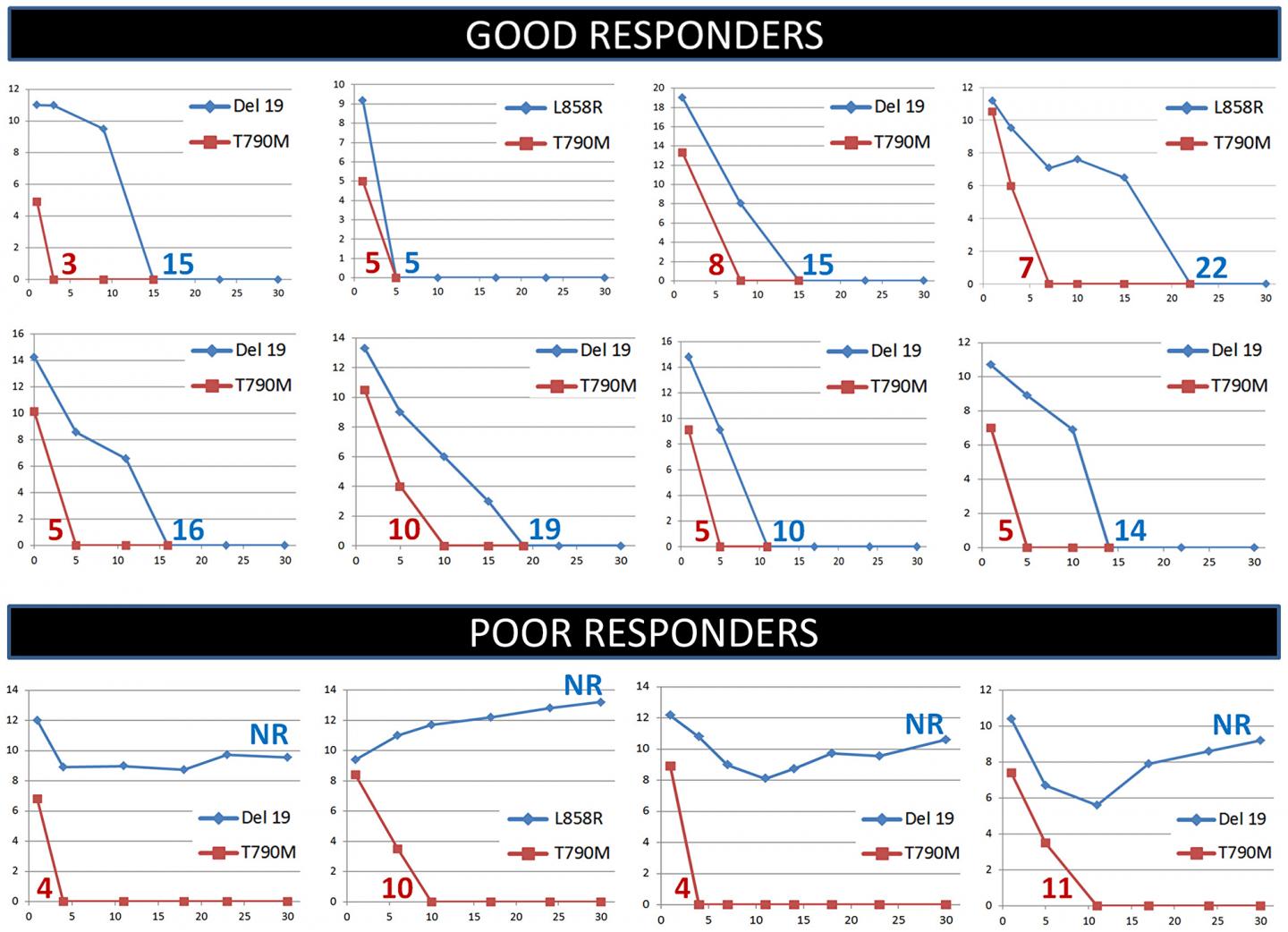 image: Monitoring of the EGFR sensitizing (blue curves) and T790M (red curves) mutations in plasma during the first month of treatment with osimertinib in non-small cell lung cancer patients. Representative cases of good and poor responders are shown. Numbers indicate clearing times for the EGFR sensitizing mutation (blue) or the T790M mutation (red). NR, clearing not reached.