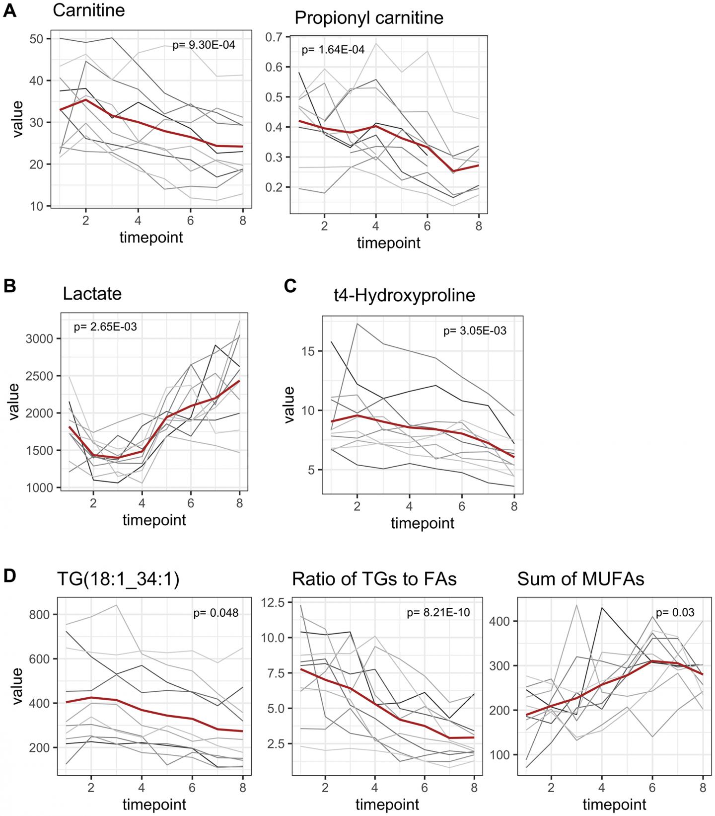image: Late onset metabolomic changes. (A) Carnitine decreased significantly from T1 to T8 (p = 9.30E-04, adjusted for multiple testing) and propionyl carnitine decreased to a slighter extent (p = 1.64E-04). (B) Highly dynamic alterations in lactate concentrations. Lactate concentrations decreased within the anesthetic period and increased to an even greater extent in the consecutive joint period (p = 2.65E-03). (C) Hydroxyproline (marker for collagen turnover) significantly decreased after beginning of surgical procedures (p = 3.05E-03). (D) Triglyceride concentrations decreased in perioperative period. Triacylglyceride 18:1_34:1 as the most abundant one is presented exemplarily. The ratio of [triacylglycerides]/|fatty acids] serves as an indicator for synthesis of triacylglycerides and decreased, symbolizing a degradation of triacylglycerides (p = 8.21E-10). Sum of fatty acids in plasma increased, although this was only significant for monounsaturated fatty acids (p = 0.03).
