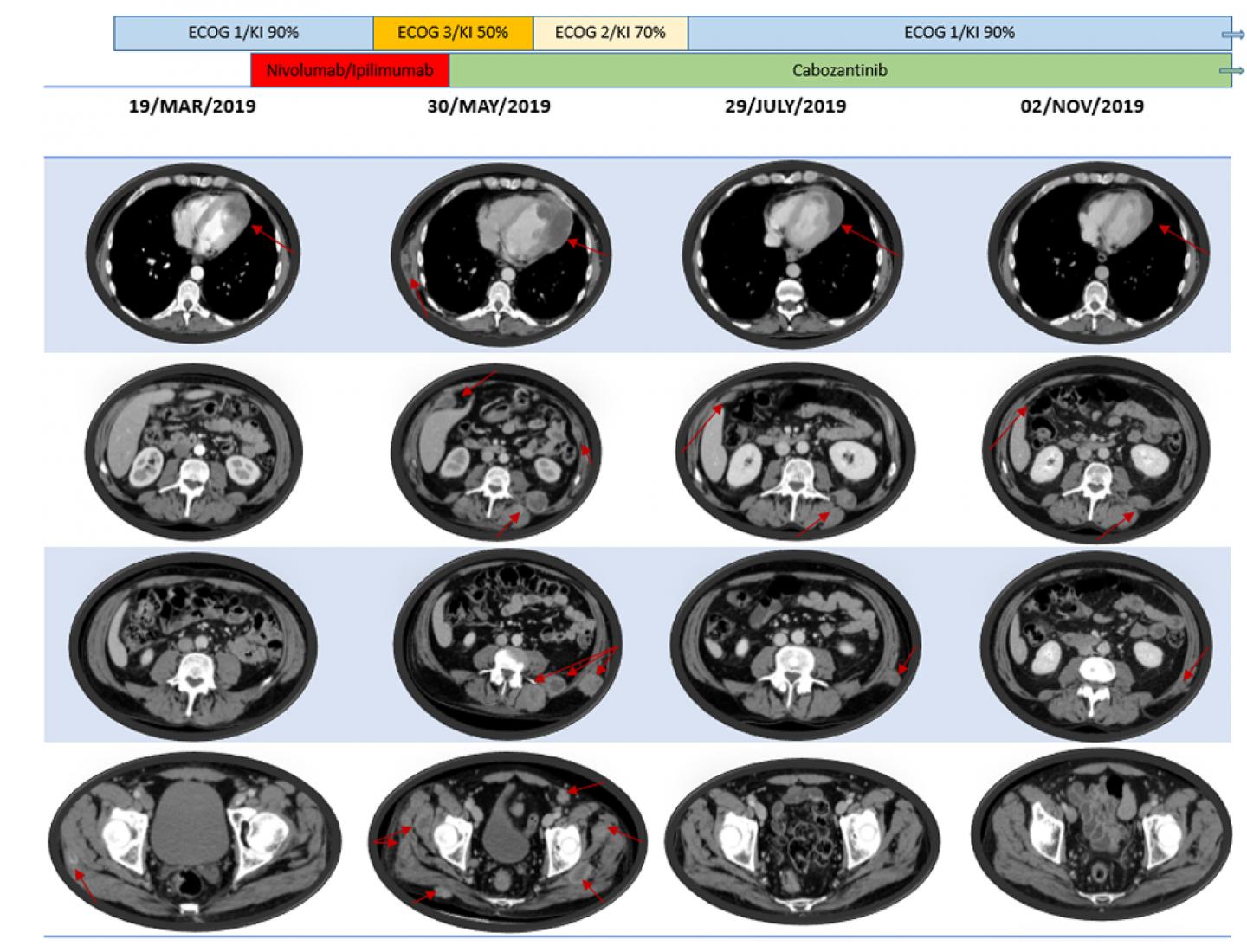 In this case, it is demonstrated that a TKI such cabozantinib can control hyperprogression phenomena in 2L of m cc RCC. Clinical trials are currently ongoing in this setting trying to elucidate, prospectively, which is the best strategy.