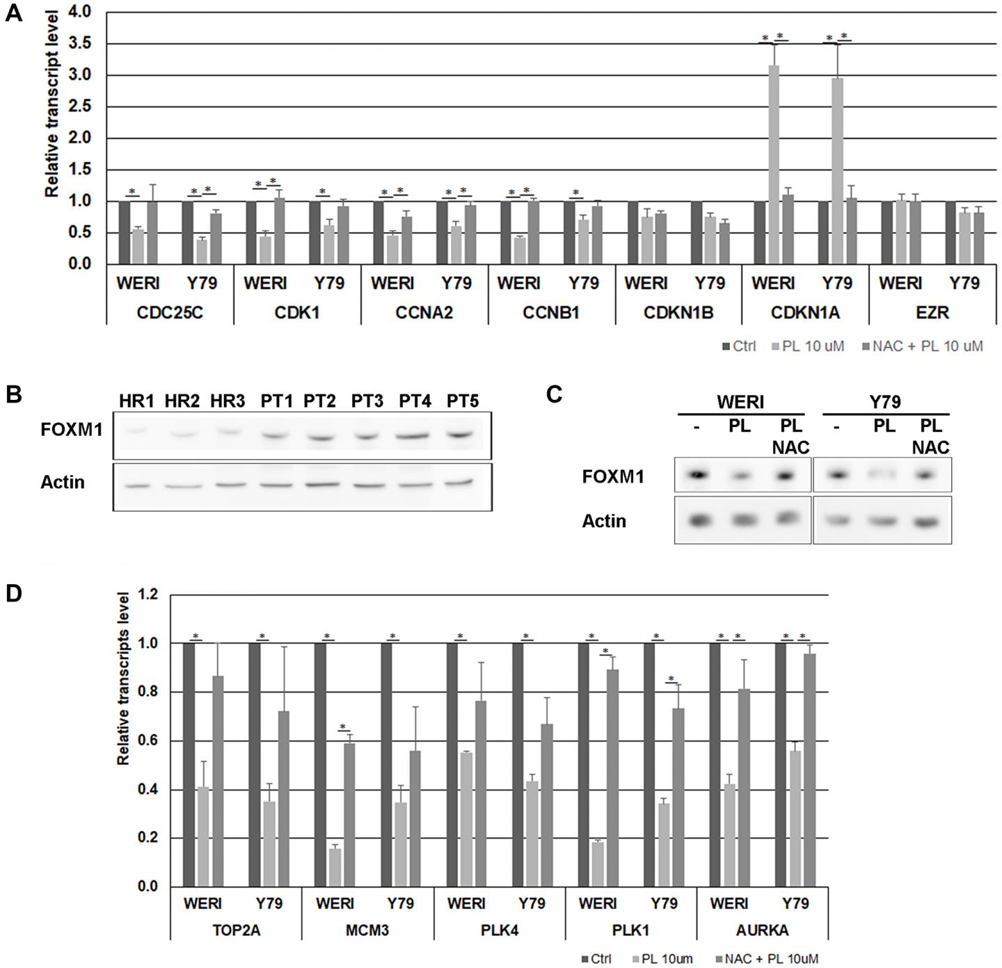 image: Effects of PL on cell cycle-regulatory factors in WERI-Rb and Y79 cells. (A) The expression of CDC25C, CDK1, CCNA2, CCNB1, CDKN1A and CDKN1B was measured at mRNA levels using real time RT-PCR. EZR transcript, encoding a cytoplasmic peripheral membrane protein, was used as a negative control and GAPDH was used as an internal control gene. Data represent the mean ± SEM (n = 3). *P < 0.05 by Student's t test. (B) The content of FOXM1 was determined in three healthy mouse retina (HR) and in five primary mouse retinoblastoma (PT) by western blot analysis. (C) WERI-Rb and Y79 were exposed to 10 μM PL for 24 h without or with 1 h pre-treatment with 3 μM NAC. FOXM1 protein level was determined by western blot experiment. (D) The expression level of FOXM1 target genes was determined by real time RT-PCR. GAPDH was used as an internal control gene. Data represent the mean ± SEM (n = 3). *P < 0.05 by Student's t test.