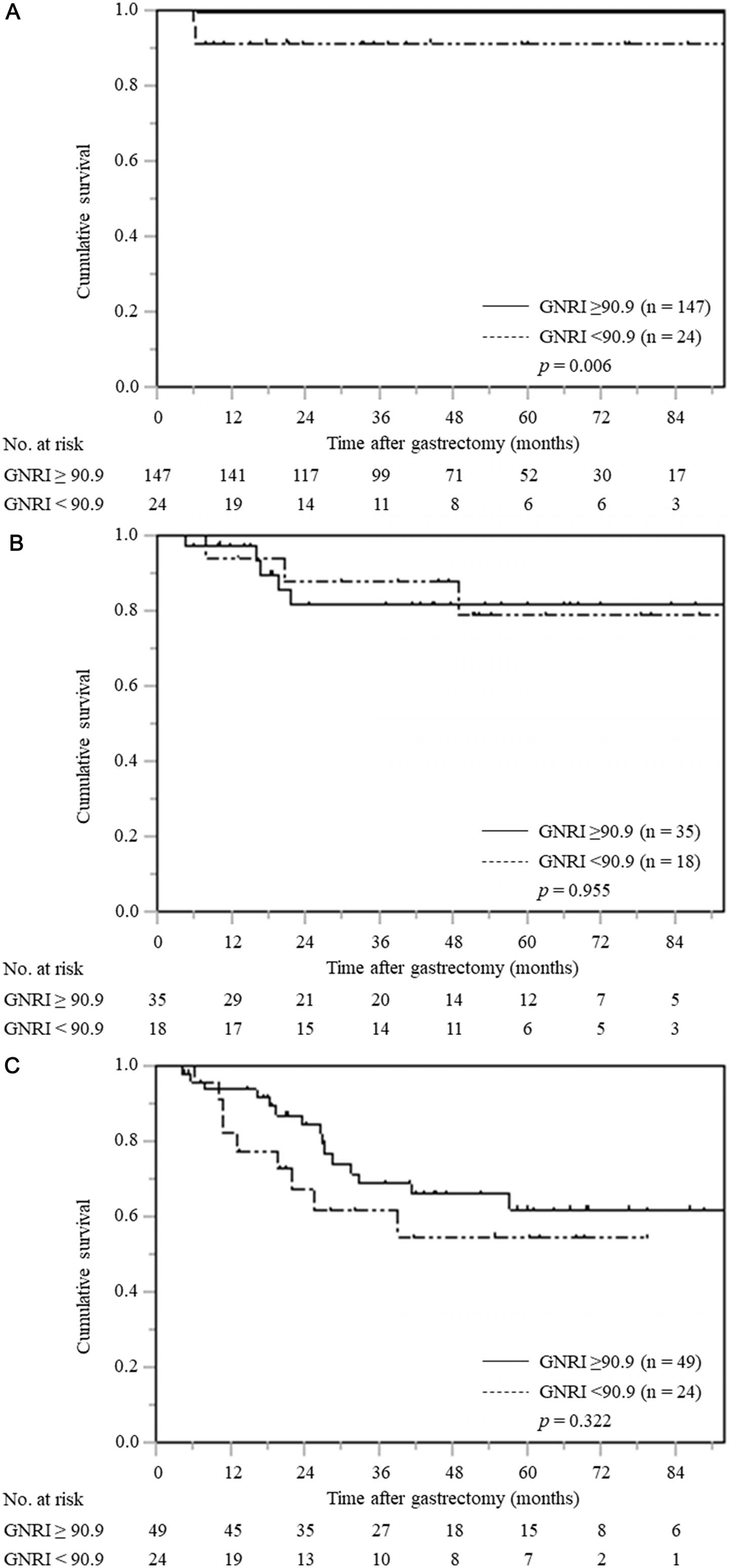 image: Cancer-specific survival curves based on GNRI according to pTNM stage. (A) pTNM stage I (n = 171), (B) pTNM stage II (n = 53), (C) pTNM stage III (n = 73).