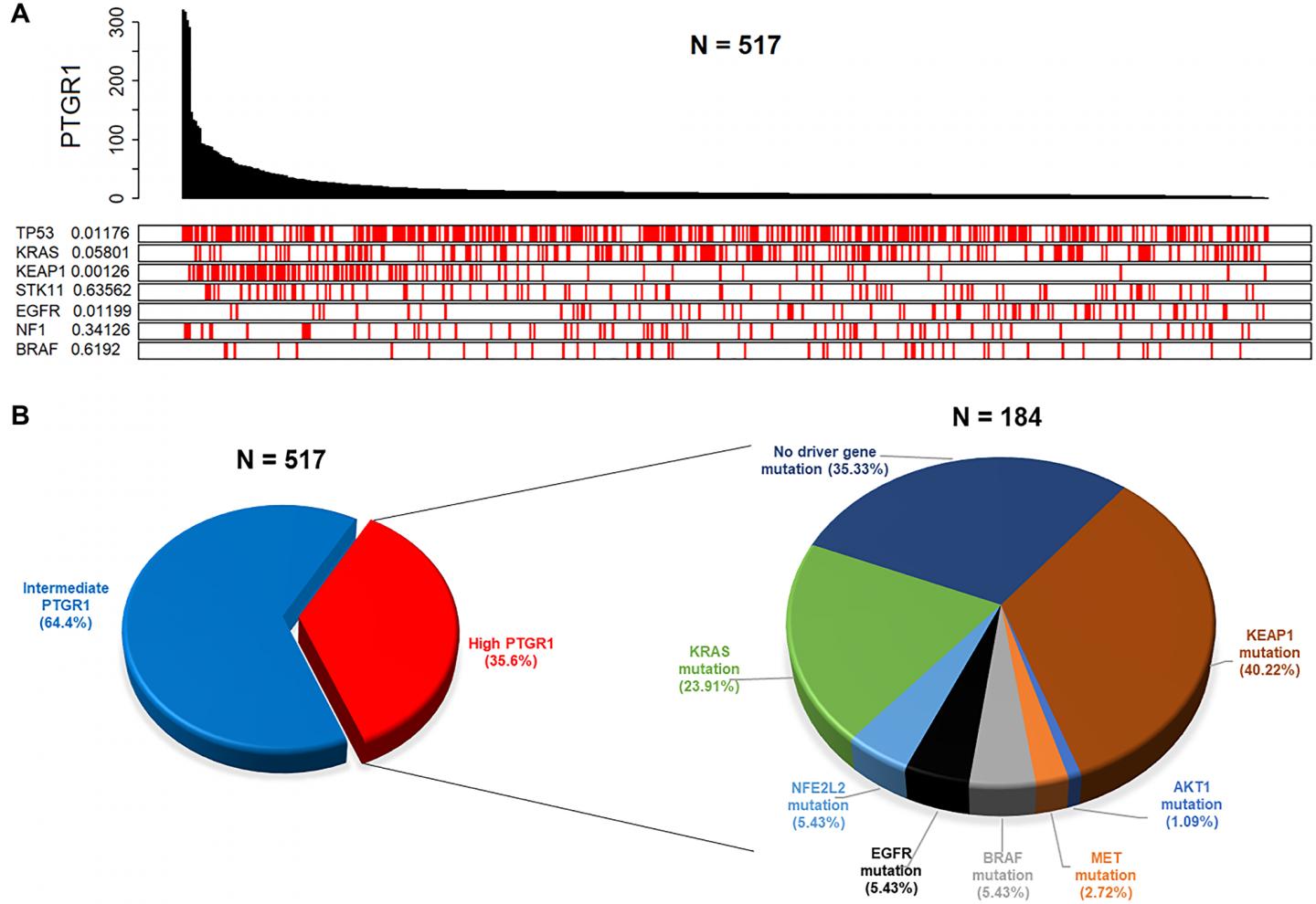 These correlations were then extended to TCGA analysis of 517 lung adenocarcinoma patients, out of which 35% showed elevated PTGR1, and 40% of those further displayed statistically significant co-occurrence of KEAP1 mutations.