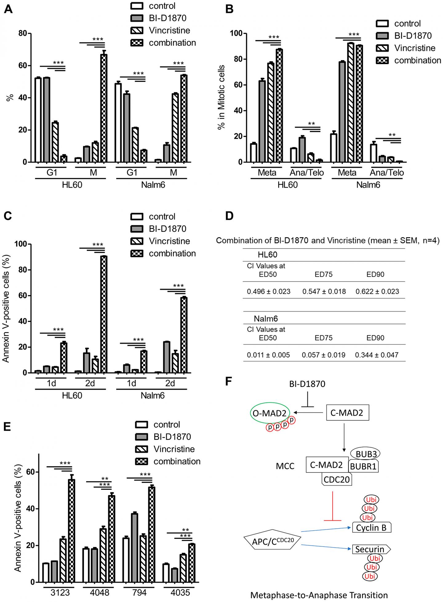image: BI-D1870 in combination with vincristine increase metaphase arrest and apoptosis synergistically. (A, B) Cell cycle distribution of HL60 and Nalm6 cells treated with BI-D1870 and vincristine. Cells were treated with BI-D1870 (2.5 μM) and/or vincristine (5 nM) for 1 d, and then cells were fixed and analyzed for cell cycle distribution. Cells were stained with 4,6-diamidino-2-phenylindole (DAPI) and antibodies. Percentages of live cell populations at each cell cycle phase determined by DNA content (DAPI) and levels of p-H3, Cyclin A, and Cyclin B were graphed. (C) Cells were treated with BI-D1870 (2.5 μM) and/or vincristine (5 nM) for 1d or 2d. Percentages of Annexin V-positive apoptotic cells are calculated. (D) Synergistic combination effect of BI-D1870 and vincristine. Cells were treated with various concentrations of BI-D1870 and vincristine for 3d. Viability was assessed using the CellTiter glo assay kit. The combination index (CI) values were calculated by the Chou-Talalay method using CalcuSyn software. CI > 1: antagonism, CI = 1: additive Effect, CI