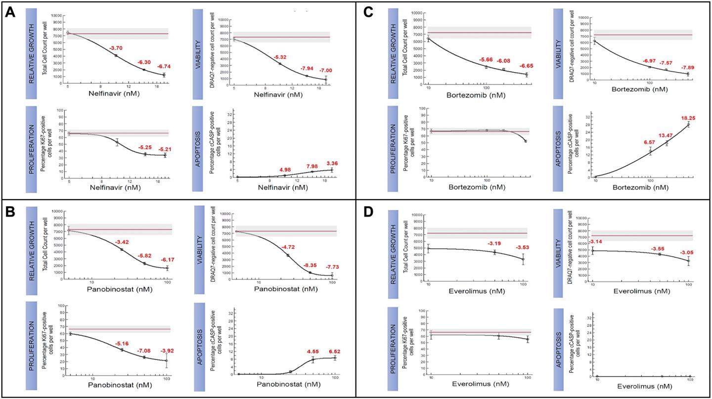 image: Candidate therapeutics tested for TH4 subtype in IU-TAB-1 cell line. Experimental dose-response curves assessing relative growth (Hoechst staining of DNA), proliferation (Ki67), viability (DRAQ7 assay), and apoptosis (caspase) for (A) Nelfinavir, (B) Panobinostat, (C) Bortezomib, and (D) Everolimus. The red line in the experimental graphs indicate DMSO treated control.