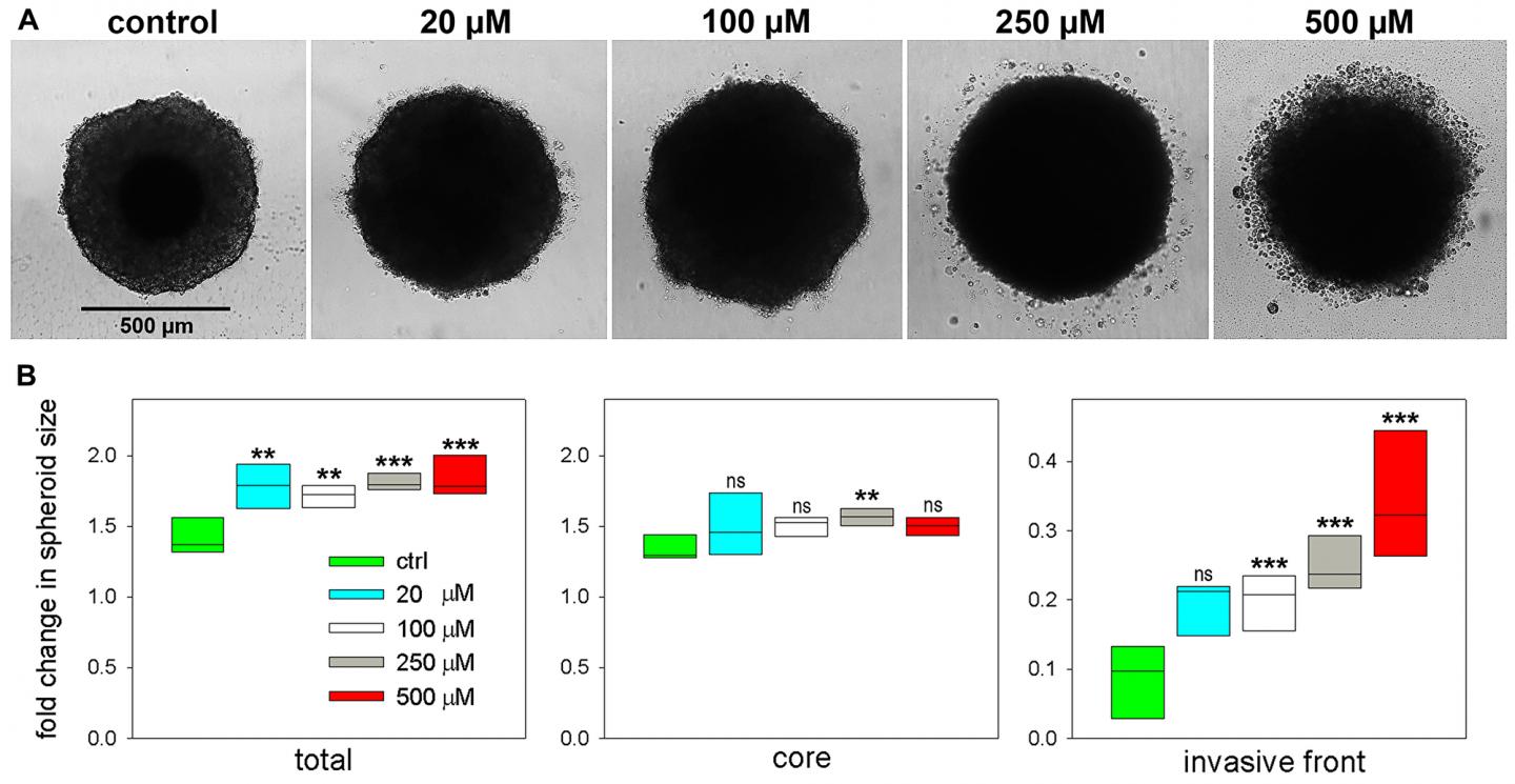 image: Effect of palmitoyl-lysophosphatidylcholine LPC[16:0] on tumor spheroid invasion and growth. 3D cell spheroids of hypopharynx squamous cell carcinoma origin were embedded in Matrigel matrix. Invasion and growth of spheroids are shown in the presence of increasing concentration of LPC[16:0] at 264 h. (A) Example images of spheroid cross-sections. (B) Size of spheroid cross-section areas are shown relative to values at 0 h (when embedding in Matrigel). Total spheroid size equals to the proliferative - necrotic core and the invasive zone. 95% CI is displayed, asterisks indicate statistical significance relative to control values.