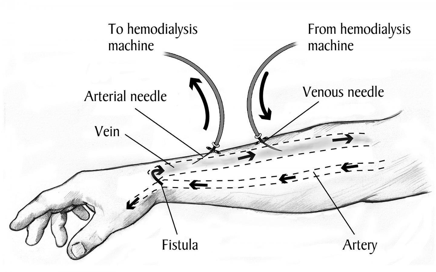 image: A diagram showing how kidney dialysis is conducted after an arteriovenous (AV) fistula surgery has provided access to the circulatory system. A new Johns Hopkins Medicine study reveals that many physicians are still performing a different, riskier procedure with a prosthetic graft for gaining access.