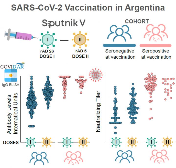 image: This graphical abstract shows antibody responses to Sputnik V vaccine in Argentina. On the top, schematic representation of the two-component adenovirus based vaccine (rAD26 and rAD5) Sputnik V. Bottom, IgG antibody levels measured by International Units and SARS CoV-2 Neutralizing Titers in vaccinated naïve (seronegative, blue) and previously infected (seropositive, red) volunteers. There is a high seroconversion rate following the first dose in naïve individuals. In previously infected participants, a single dose of Sputnik V elicits a fast and robust antibody response without apparent benefit from a second dose.