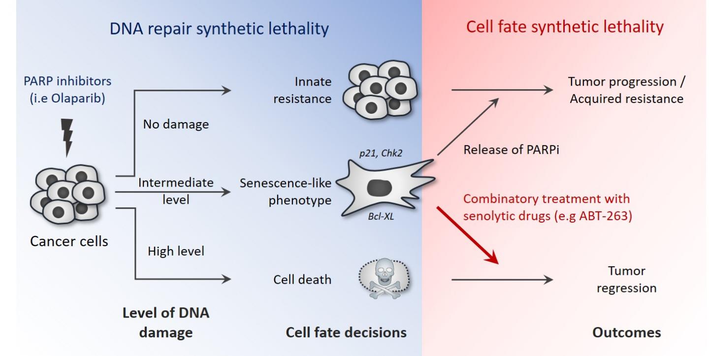 image: Model of targetable PARPi reversible senescence. The combination of PARPi and a senolytic was effective in preclinical models of ovarian cancer suggesting that coupling these synthetic lethalities provides a rational approach to their clinical use and may together be more effective in limiting resistance.