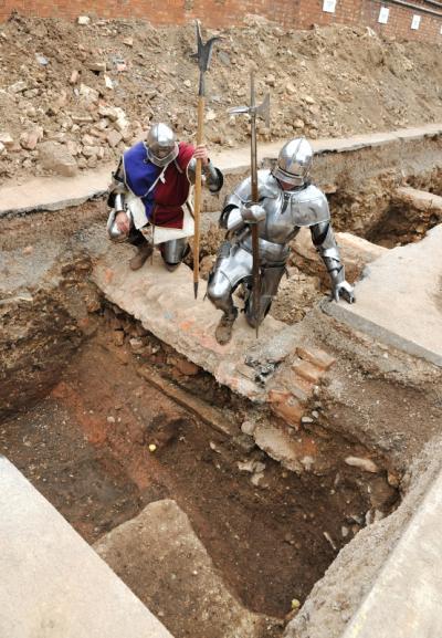 Medieval re-enactors stand guard at the spot that the remains were recovered.