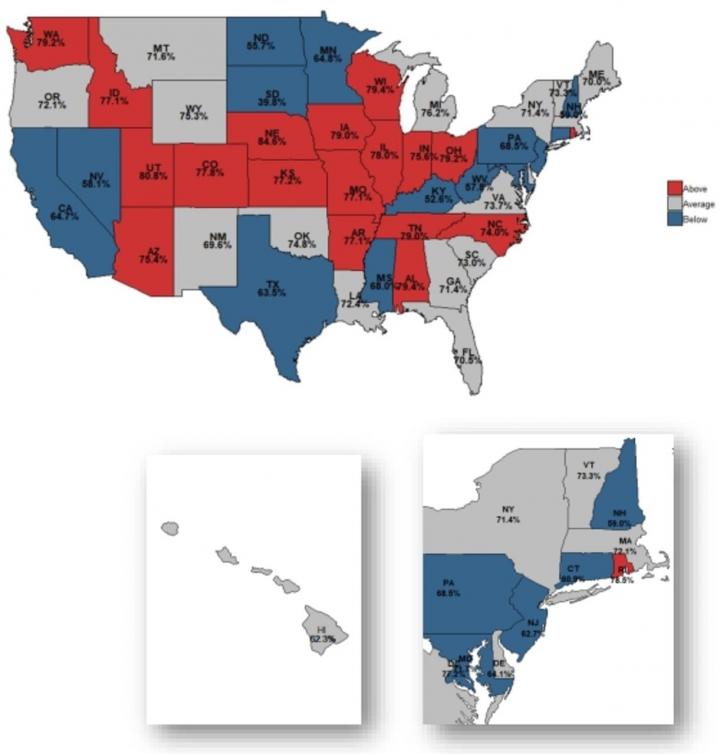 image: Observed to expected opioid prescribing rate. State-level variation in the opioid prescribing rate for knee arthroscopies among patients who were opioid-naïve. The median state-level prescribing rate during these years was 72%. The observed prescribed rate is displayed within each state. States with higher-than-expected prescribing rates based on covariates are highlighted in red and those with lower-than-expected prescribing rates are shown in blue. Expected prescribing rate was adjusted for casemix with age, sex, procedure type, race, ethnicity, education, household income, comorbidities and year, using multivariate logistic regression.