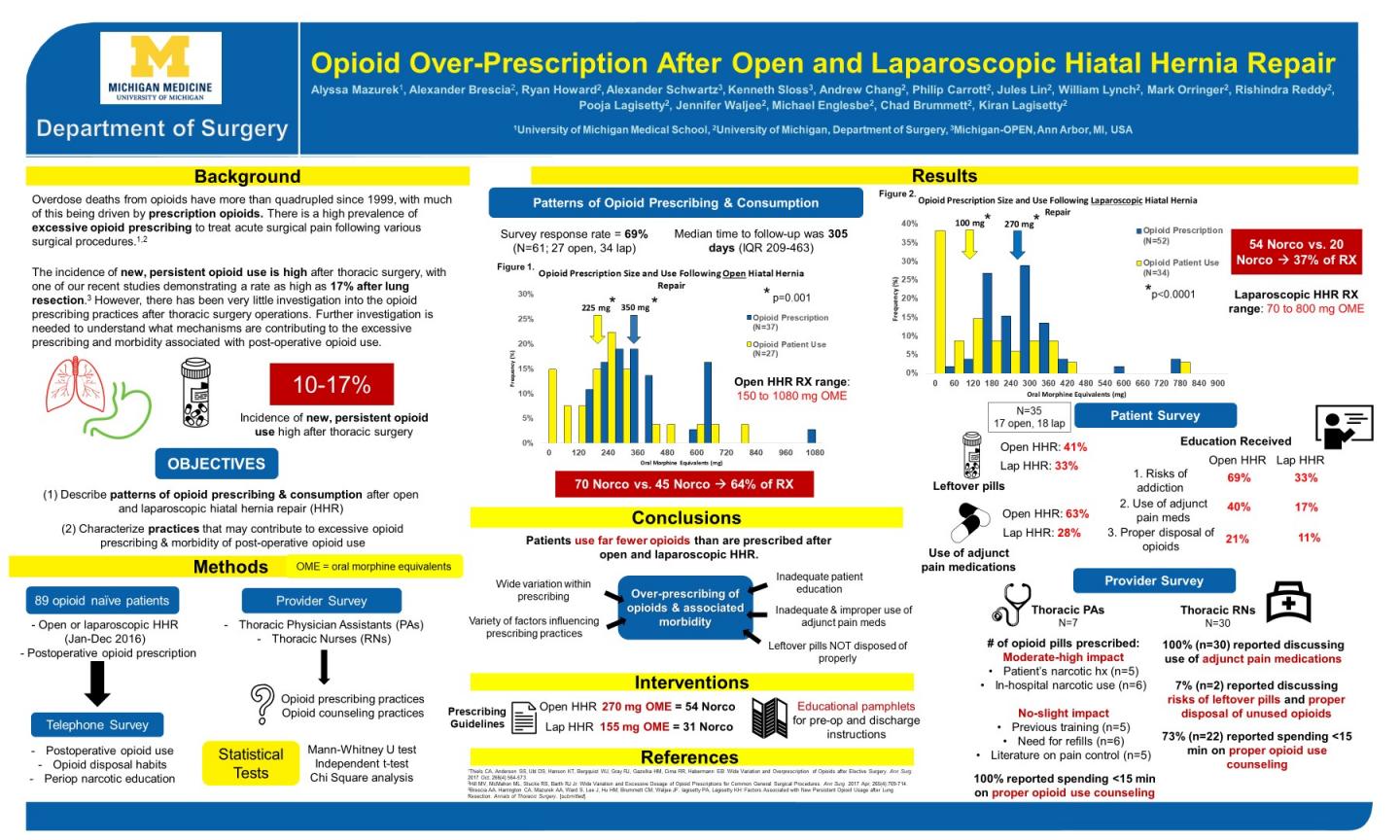 SAN DIEGO - May 1, 2018 - The increase in opioid deaths in the last 20 years led a medical student at the University of Michigan Medical School and colleagues to look at excessive opioids prescribed to treat acute surgical pain following various procedures. Alyssa A. Mazurek presented a study during the American Association for Thoracic Surgery's 98th Annual Meeting that assessed patterns of opioid prescribing for open and laparoscopic hiatal hernia repair (HHR) and found that patients used far fewer opioids than were actually prescribed.