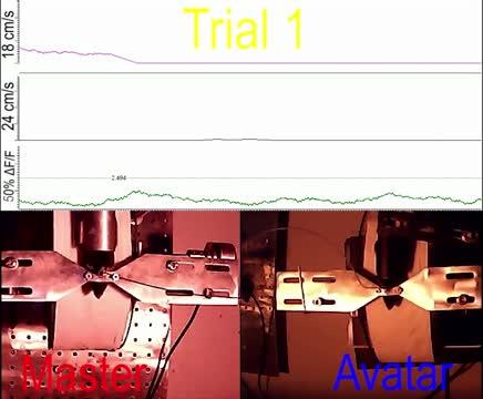 video: An optical BtBI enables a Master mouse to control the locomotion of an Avatar mouse. The plots show, from to top to bottom, the Avatar's locomotor speed, timing of light pulses (5 ms) delivered into the Avatar mouse, the Master's locomotor speed, and Ca2+ signals from the NI of the Master. The Master and Avatar (bottom left and right) were head-fixed on two distant wheel treadmills. Note that the dyad walked in synchrony with slight time lag.