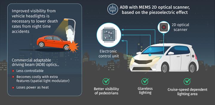 The researchers designed the optical scanner on a single chip consisting of a bonded silicon-on-insulator wafer with the PZT layer grown on it and laminated with metal to form piezoelectric actuators. They arranged the actuators as suspensions to allow for large-angle horizontal and vertical deflections of the scanner. This, in turn, enabled two-dimensional scanning of the headlight beam. Further, they designed the modes so that they don't react to low-frequency noise, such as from other vehicles. Their ADB system also accounts for temperature variations. Finally, they mounted the module on a vehicle and evaluated its performance for actual driving.