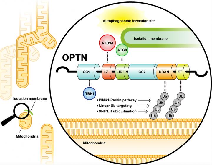 image: Damaged mitochondria are selectively eliminated via autophagy called mitophagy. In mammalian cells, ubiquitin chains on the damaged mitochondria play critical roles to induce mitophagy. Researchers at Tokyo Metropolitan Institute of Medical Science (TMIMS) discovered that the critical autophagy adaptor OPTN (optineurin) interacts with ATG9A, the leucine zipper domain (LZ) in OPTN is essential for their interactions, and the OPTN-ATG9A binding plays a critical role in ubiquitin-mediated mitophagy (Yamano et al., Journal of Cell Biology 2020).