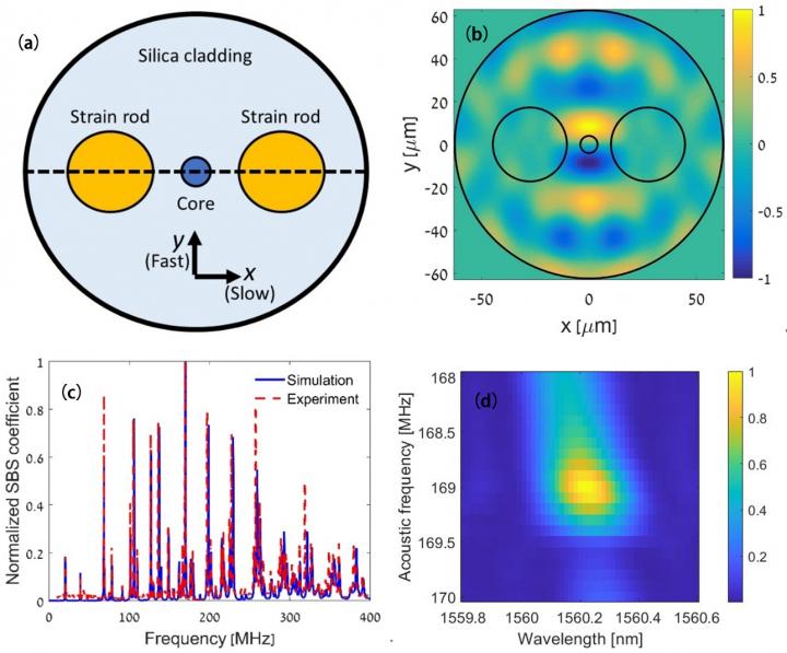 image: a, Schematic cross-section of a "panda-type" fiber. Two strain rods induce strain in the fiber, and distinguish between propagation in "slow" and "fast" axes. b, Profile of material displacement of an acoustic wave supported by the panda fiber cross-section. c, Measurement and calculations of the spectrum of acoustic waves that are driven by light in the panda fiber. The acoustic waves are stimulated by a pair of optical tones: one polarized along the fast axis and the other along the slow one. d, Switching of optical probe waves between fast and slow axes. The switching of polarization can be induced at specific wavelengths (horizontal axis), through acoustic waves of specific frequencies (vertical axis). The switching effect is non-reciprocal: it takes place for one direction of propagation of the optical probe wave along the fiber, but not for the opposite one.